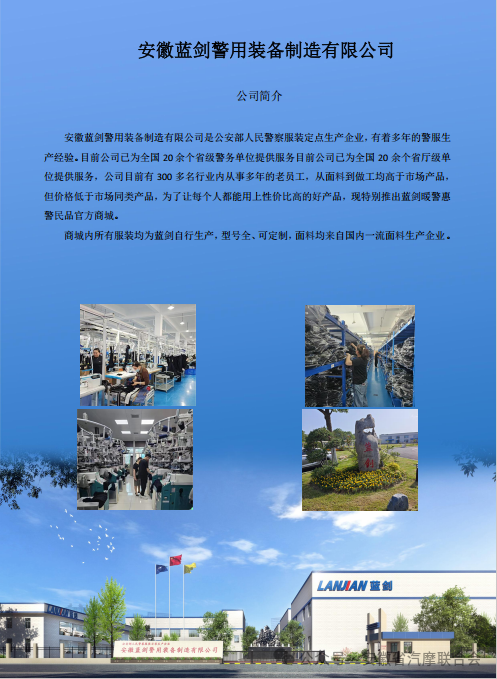 安徽蓝剑警用装备制造有限公司,经营范围包括警用装备、防护装备、服装鞋帽、腰带、反光背心、骑行服、背包、电暖服装服饰、手套口罩、领带眼镜、床上用品、照明器材;安检排爆器材、红外测温器材、道路交通安全防护器材、通讯设备、消防器材、破拆救援器材、防毒设备、夜视仪。